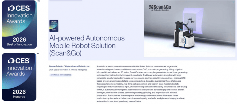 目前,AARS恰是这一手艺的集中表现。联袂合做伙伴斗山机械人(Doosan Robotics),同时入选 “机械人” 类别立异荣誉名单,和意精工将继续联袂全球领先的机械人制制商取系统集成商,